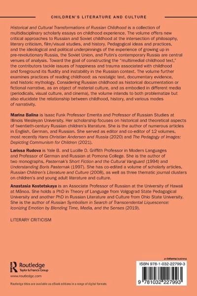 Historical and Cultural Transformations of Russian Childhood is a collection of multidisciplinary scholarly essays on childhood experience. The volume offers new critical approaches to Russian and Soviet childhood at the intersection of philosophy, literary criticism, film/visual studies, and history. Pedagogical ideas and practices, and the ideological and political underpinnings of the experience of growing up in pre-revolutionary Russia, the Soviet Union, and Putin's contemporary Russia are central venues of analysis. Toward the goal of constructing the "multimedial childhood text," the contributors tackle issues of happiness and trauma associated with childhood and foreground its fluidity and instability in the Russian context. The volume further examines practices of reading childhood: as nostalgic text, documentary evidence, and historic mythology. Considering Russian childhood as historical documentation or fictional narrative, as an object of material culture, and as embodied in different media (periodicals, visual culture, and cinema), the volume intends to both problematize but also elucidate the relationship between childhood, history, and various modes of narrativity.