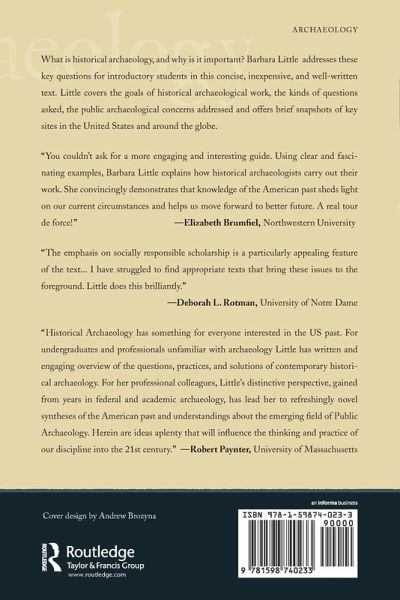 What is historical archaeology and why is it important? Well-known archaeologist Barbara Little addresses these key questions for introductory students in this concise, inexpensive, and well-written text. Little covers the goals of historical archaeological work, the kinds of questions it asks, and the ethical and political concerns it raises. She shows what historical archaeology can provide that neither of its parent disciplines can offer alone. Little offers brief snapshots of key American sites: Jamestown, Mission San Luis, West Oakland, the African American Burial Ground, and the Garbage Project, among others. And she shows how historical archaeology is inextricably linked to public education, justice issues, and our collective understanding of the past. As an introductory guide for historical archaeology and similar courses, or as thought-provoking reading for professionals, this volume is unmatched in quality and scope.