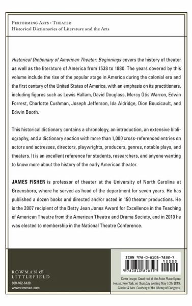 Historical Dictionary of American Theater: Beginnings covers the history of theater as well as the literature of America from 1538 to 1880. The years covered by this volume features the rise of the popular stage in American during the colonial era and the first century of the United States of America, with an emphasis on its practitioners, including such figures as Lewis Hallam, David Douglass, Mercy Otis Warren, Edwin Forrest, Charlotte Cushman, Joseph Jefferson, Ida Aldridge, Dion Boucicault, Edwin Booth, and many others. The Historical Dictionary of American Theater: Beginnings covers the history of early American Theatre through a chronology, an introductory essay, and an extensive bibliography. The dictionary section has over 1000 cross-referenced entries on actors and actresses, directors, playwrights, producers, genres, notable plays and theatres. This book is an excellent access point for students, researchers, and anyone wanting to know more about the early American Theater.