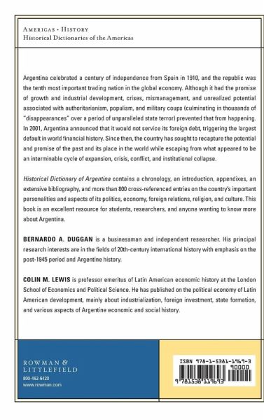 The Historical Dictionary of Argentina contains a chronology, an introduction, appendixes, and an extensive bibliography. The dictionary section has over 800 cross-referenced entries on important personalities, politics, economy, foreign relations, religion, and culture.
