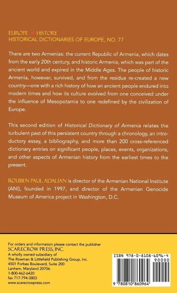 The second edition of the Historical Dictionary of Armenia relates the turbulent past of this persistent country through a chronology, an introductory essay, a bibliography, and over 200 cross-referenced dictionary entries on significant persons, events, places, organizations, and other aspects of Armenian history from the earliest times to the present.