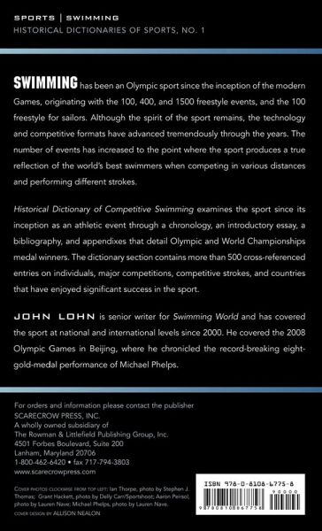 The Historical Dictionary of Competitive Swimming examines the sport of swimming since its inception as a competitive athletic event. This is done through a chronology, an introductory essay, a bibliography, and appendixes that detail Olympic and World Championships medal winners. The dictionary section has over 500 cross-referenced dictionary entries on individuals, major competitions, and there are also entries for each of the competitive strokes and countries that have enjoyed significant success in the sport.