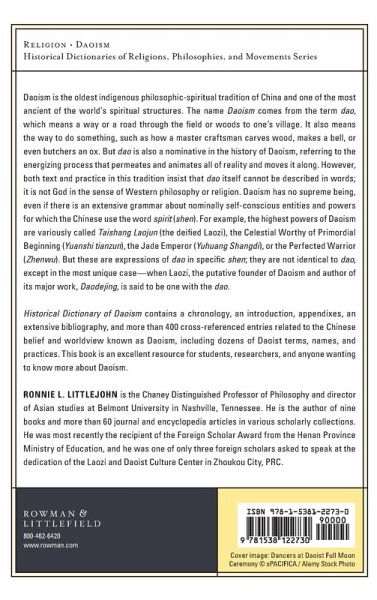 Historical Dictionary of Daoism contains a chronology, an introduction, appendixes and an extensive bibliography. The dictionary section has over 400 cross-referenced entries on related to the Chinese belief and practice worldview known as Daoism including dozens of Daoist terms, names, and practices.