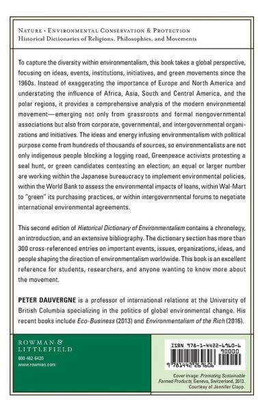 This second edition of Historical Dictionary of Environmentalism contains a chronology, an introduction, and an extensive bibliography. The dictionary section has over 300 cross-referenced entries on important events, issues, organizations, ideas, and people shaping the direction of environmentalism worldwide.