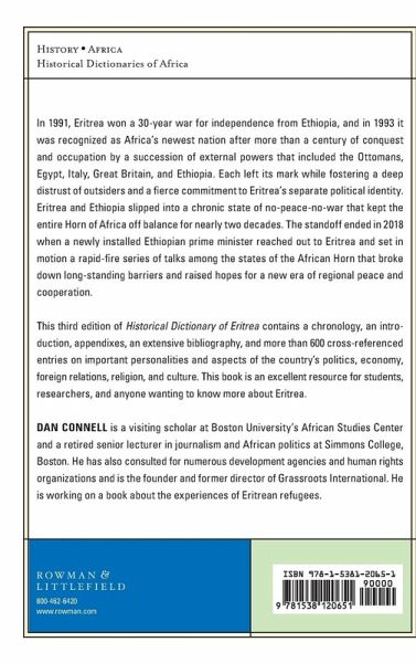 This third edition of Historical Dictionary of Eritrea contains a chronology, an introduction, appendixes, and an extensive bibliography. The dictionary section has over 600 cross-referenced entries on important personalities, politics, economy, foreign relations, religion, and culture.