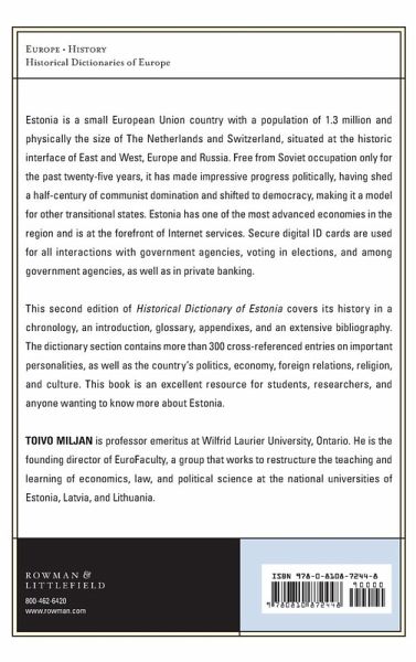 This second edition of Historical Dictionary of Estonia covers its history through a chronology, an introductory essay, glossary, appendixes, and an extensive bibliography. The dictionary section has over 300 cross-referenced entries on important personalities, politics, economy, foreign relations, religion, and culture.