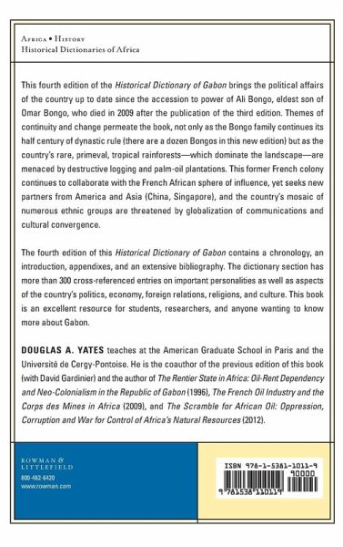 This new fourth edition of the Historical Dictionary of Gabon brings up to date the political affairs of the country, since the accession to power of Ali Bongo, eldest son of Omar Bongo, the former president-for-life, who died in 2009 after the publication of the third edition. Themes of "continuity" and "change" are present throughout the entries, not only as the Bongo family continues its half century of dynastic rule (there are a dozen Bongos in this new edition), but as the rare primeval tropical rainforests continue to dominate the landscape yet are menaced by destructive logging and palm oil plantations, and as this former French colony after independence continues to collaborate with the French African sphere of influence yet seeks new partners from America and Asia (China, Singapore), and as the country's numerous ethnic groups perpetuate a multicultural mosaic that is nevertheless threatened by globalization of communications and cultural convergence. This fourth editionof Historical Dictionary of Gabon contains a chronology, an introduction, appendixes, and an extensive bibliography. The dictionary section has over 300 cross-referenced entries on important personalities, politics, economy, foreign relations, religion, and culture. This book is an excellent resource for students, researchers, and anyone wanting to know more about Gabon.