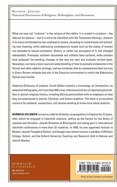 What we now call "Judaism" is the religion of the rabbis; it is rooted in scripture-the Hebrew Scriptures-but it is not to be identified with Old Testament theology. Judaism in its many manifestations has continued to evolve, rereading its ancient texts and extracting new meaning, while addressing contemporary issues such as the status of women and attitudes to sexual orientation. History, or rather our perception of it, has changed substantially. Previously unknown documents and artefacts have surfaced, while scholars have proposed far-reaching changes to the way we read and evaluate ancient texts. Nowadays, we have a more nuanced understanding of how to evaluate statements in the Talmud and other rabbinic writings, and we are better able to contextualize them not only in Greco-Roman antiquity but also in the Sasanian environment in which the Babylonian Talmud was formed. Historical Dictionary of Judaism, Fourth Edition contains a chronology, an introduction, and an extensive bibliography. The dictionary section has more than 800 cross-referenced entries on on important personalities in Jewish religious history, including biblical personalities with an emphasis on how they are understood in Jewish, Christian, and Islamic tradition. This book is an excellent access point for students, researchers, and anyone wanting to know more about Judaism.