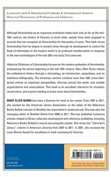 The Historical Dictionary of Librarianship focuses on librarianship as a modern, organized profession, emphasizing the period beginning in the mid-nineteenth century. Author Mary Ellen Quinn relates the history of this profession through a chronology, an introductory essay, appendixes, and an extensive bibliography.