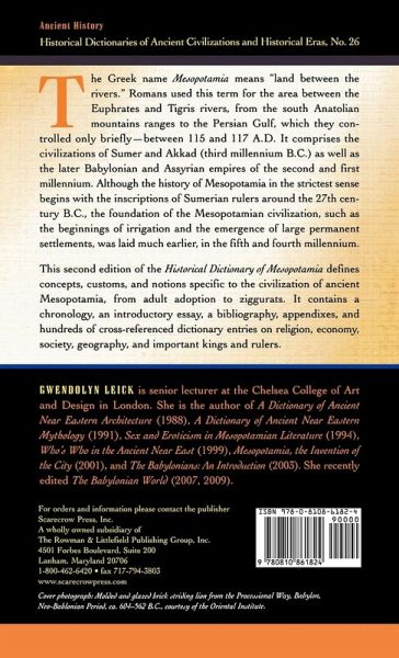 The second edition of the Historical Dictionary of Mesopotamia defines concepts, customs, and notions peculiar to the civilization of ancient Mesopotamia, from adult adoption to ziggurats. This is accomplished through a chronology, an introductory essay, a bibliography, appendixes, and hundreds of cross-reference dictionary entries on religion, economy, society, geography, and important kings and rulers.
