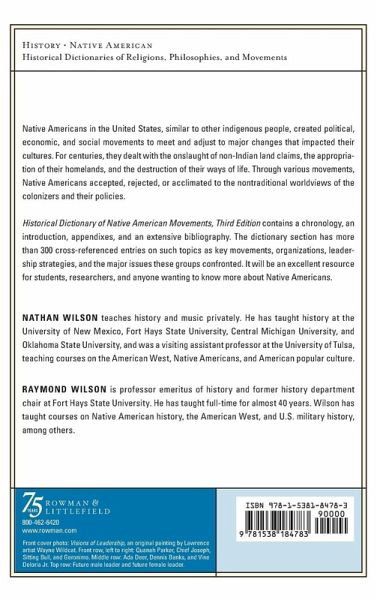 Native Americans in the United States, similar to other indigenous people, created political, economic, and social movements to meet and adjust to major changes that impacted their cultures. For centuries, Native Americans dealt with the onslaught of non-Indian land claims, the appropriation of their homelands, and the destruction of their ways of life. Through various movements, Native Americans accepted, rejected, or acclimated to the nontraditional worldviews of the colonizers and their policies. Historical Dictionary of Native American Movements, Third Edition contains a chronology, an introduction, appendixes, and an extensive bibliography. The dictionary section has more than 300 cross-referenced entries on such topics as key movements, organizations, leadership strategies, and the major issues these groups confronted. This book is an excellent resource for students, researchers, and anyone wanting to know more about Native Americans.