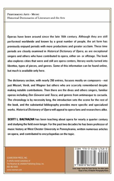 Opera has been around ever since the late 16th century, and it is still going strong in the sense that operas are performed around the world at present, and known by infinitely more persons than just those who attend performances. On the other hand, it has enjoyed periods in the past when more operas were produced to greater acclaim. Those periods inevitably have pride of place in this Historical Dictionary of Opera, as do exceptional singers, and others who combine to fashion the opera, whether or not they appear on stage. But this volume looks even further afield, considering the cities which were and still are opera centers, literary works which were turned into librettos, and types of pieces and genres. While some of the former can be found on the web or in other sources, most of the latter cannot and it is impossible to have the whole picture without them. Indeed, this book has an amazingly broad scope. The dictionary section, with about 340 entries, covers the topics mentioned above but obviously focuses most on composers, not just the likes of Mozart, Verdi and Wagner, but others who are scarcely remembered but made notable contributions. Of course, there are the divas, but others singers as well, and some of the most familiar operas, Don Giovanni, Tosca and more. Technical terms also abound, and reference to different genres, from antimasque to zarzuela. Since opera has been around so long, the chronology is rather lengthy, since it has a lot of ground to cover, and the introduction sets the scene for the rest. This book should not be an end but rather a beginning, so it has a substantial bibliography for readers seeking more specific or specialized works. It is an excellent access point for readers interested in opera.