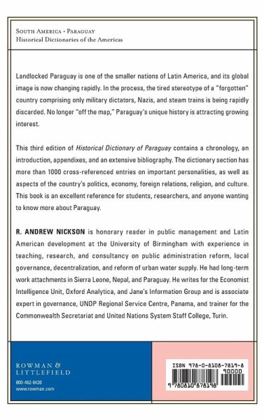 Foreword by, Jon Woronoff Preface Acronyms and Abbreviations Maps General Map Administrative Departments Provincia Gigante de las Indias Chronology Introduction THE DICTIONARY Appendixes Appendix 1: Colonial Governors of Paraguay Appendix 2: Presidents of Paraguay Appendix 3: Mayors of Asunción Appendix 4: United States Ambassadors to Paraguay Appendix 5: Place Name Changes Bibliography About the Author