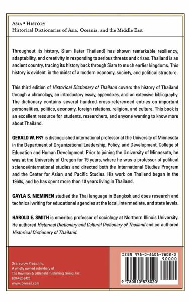 The Historical Dictionary of Thailand, Third Edition covers the history of Thailand through a chronology, an introductory essay, appendixes, and an extensive bibliography. The dictionary section has several hundred cross-referenced entries on important personalities, politics, economy, foreign relations, religion, and culture. This book is an excellent access point for students, researchers, and anyone wanting to know more about Thailand.