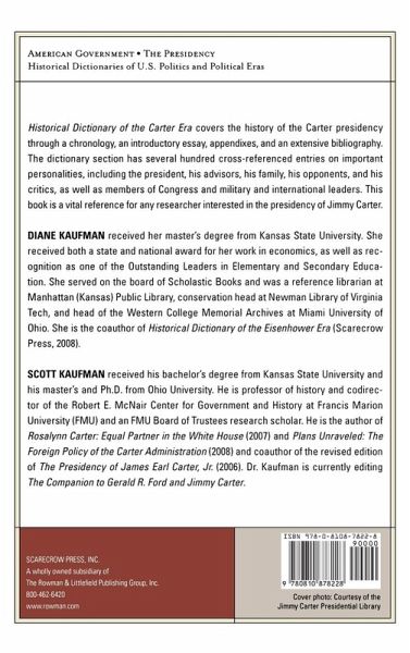 The Historical Dictionary of the Carter Era covers the history of the Carter presidency through a chronology, an introductory essay, appendixes, an extensive bibliography. The dictionary section has several hundred cross-referenced entries on important personalities, including the president, his advisors, his family, his opponents, and his critics, as well as members of Congress, military leaders, and international leaders. This book is a vital reference tool for any researcher interested in the presidency of Jimmy Carter.