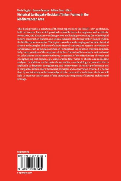 This book presents a selection of the best papers from the HEaRT 2013 conference, held in Cosenza, Italy, which provided a valuable forum for engineers and architects, researchers and educators to exchange views and findings concerning the technological history, construction features and seismic behavior of historical timber-framed walls in the Mediterranean countries. The topics covered are wide ranging and include historical aspects and examples of the use of timber-framed construction systems in response to earthquakes, such as the gaiola system in Portugal and the Bourbon system in southern Italy; interpretation of the response of timber-framed walls to seismic actions based on calculations and experimental tests; assessment of the effectiveness of repair and strengthening techniques, e.g., using aramid fiber wires or sheets; and modelling analyses. In addition, on the basis of case studies, a methodology is presented that is applicable to diagnosis, strengthening and improvement of seismic performance and is compatible with modern theoretical principles and conservation criteria. It is hoped that, by contributing to the knowledge of this construction technique, the book will help to promote conservation of this important component of Europe's architectural heritage.
