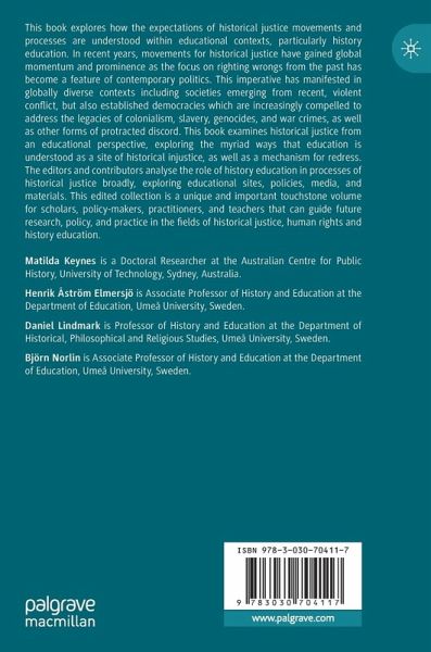 Chapter 1. Introduction: Connecting Historical Justice and History Education; Matilda Keynes, Henrik Åström Elmersjö, Daniel Lindmark and Björn Norlin.- Part I: State-Sponsored Processes and Education.- Chapter 2. Recontextualizing historical injustice into education: The relationship between a White Paper and a textbook on the abuse of the Roma in Swedish history; Malin Arvidsson, Henrik Åström Elmersjö.- Chapter 3. Taking responsibility for the past: Theoretical and educational considerations, illustrated by South African experience; Sirkka Ahonen.- Chapter 4. Education and truth commissions: Patterns, possibilities and implications for historical justice; Julia Paulson, Michelle J. Bellino.- Part II: Historical Justice in Public History Spaces.- Chapter 5. The Hanaoka Incident and Practices of Local History and Memory Making in Northern Japan; Erik Ropers.- Chapter 6. Historical narratives and civic subjectification inthe aftermath of conflict; Daniela Romero-Amaya.- Chapter 7. Generating and Popularising Historical Knowledge in a Reconciliation Pro-cess: The Case of the Church of Sweden and the Sami; Björn Norlin, Daniel Lindmark.- Chapter 8. The role of commemoration in history and heritage: the legacy of the World War One Engagement Centres; Nicola Gauld, Ian Grosvenor.- Chapter 9. 9.Challenging 'comfort women' discourse: rethinking intersections of historical justice and history education; Anna-Karin Eriksson.- Chapter 10. Ethics and historical justice; Göran Collste.- Part III: Educational Materials: Textbooks, Curricula, Policy.- Chapter 11. Textbook Revisions as Educational Atonement? Possibilities and challenges of history education as a means to historical justice; Eleni Christodoulou.- Chapter 12. Redressing historical wrongs or replicating settler colonialism? Social studies curriculum reform in Canada; James Miles.-Chapter 13. Narrative Justice? Ten tools to deconstruct narratives about violent pasts; Angela Bermudez.- Chapter 14. History education, transitional justice and politics of reconciliation: Multi- and univocality around violent pasts in South African and Rwandan textbooks; Denise Bentrovato.- Part IV: Pedagogy, Teachers, and Students.- Chapter 15. Practicing reconciliation in a Canadian book club; Jonathan Anuik.- Chapter 16. Developing historical consciousness for social cohesion: How South African students learn to construct the relationship between past and present; Natasha Robinson.- Chapter 17. Historical justice and the Holocaust in history education; Andy Pearce, Stuart Foster.- Chapter 18. Do teachers care about historical justice? Teaching about the Holocaust, genocide, and colonialism in England; Heather Mann.- Chapter 19. Political good-will, moral lessons, historical justice? Upper secondary school students onthe motives and effects of historical apologies; Jan Löfström.
