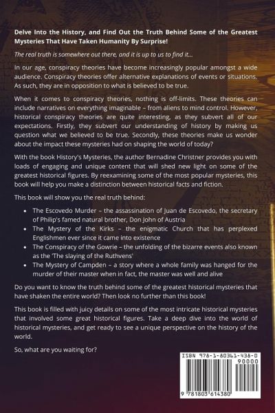 Delve Into the History, and Find Out the Truth Behind Some of the Greatest Mysteries That Have Taken Humanity By Surprise!The real truth is somewhere out there, and it is up to us to find it... In our age, conspiracy theories have become increasingly popular amongst a wide audience. Conspiracy theories offer alternative explanations of events or situations. As such, they are in opposition to what is believed to be true. When it comes to conspiracy theories, nothing is off-limits. These theories can include narratives on everything imaginable - from aliens to mind control. However, historical conspiracy theories are quite interesting, as they subvert all of our expectations. Firstly, they subvert our understanding of history by making us question what we believed to be true. Secondly, these theories make us wonder about the impact these mysteries had on shaping the world of today? With the book History's Mysteries, the author Bernadine Christner provides you with loads of engaging and unique content that will shed new light on some of the greatest historical figures. By reexamining some of the most popular mysteries, this book will help you make a distinction between historical facts and fiction. This book will show you the real truth behind:· The Escovedo Murder - the assassination of Juan de Escovedo, the secretary of Philip's famed natural brother, Don John of Austria· The Mystery of the Kirks - the enigmatic Church that has perplexed Englishmen ever since it came into existence· The Conspiracy of the Gowrie - the unfolding of the bizarre events also known as the 'The slaying of the Ruthvens' · The Mystery of Campden - a story where a whole family was hanged for the murder of their master when in fact, the master was well and alive Do you want to know the truth behind some of the greatest historical mysteries that have shaken the entire world? Then look no further than this book!This book is filled with juicy details on some of the most intricate historical mysteries that involved some great historical figures. Take a deep dive into the world of historical mysteries, and get ready to see a unique perspective on the history of the world. So, what are you waiting for?