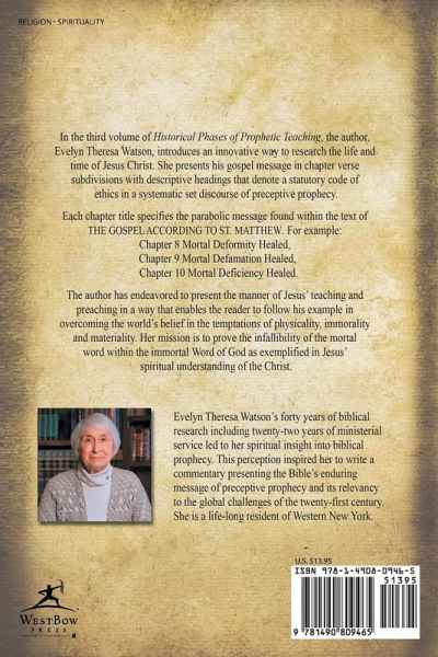 In the third volume of Historical Phases of Prophetic Teaching, the author, Evelyn Theresa Watson, introduces an innovative way to research the life and time of Jesus Christ. She presents his gospel message in chapter verse subdivisions with descriptive headings that denote a statutory code of ethics in a systematic or set discourse of preceptive prophecy. Each chapter title specifies the parabolic message found within the text of THE GOSPEL ACCORDING TO ST. MATTHEW. For example: Chapter 8 Mortal Deformity Healed, Chapter 9 Mortal Defamation Healed, Chapter 10 Mortal Deficiency Healed. The author has endeavored to present the manner of Jesus' teaching and preaching in a way that enables the reader to follow his example in overcoming the world's belief in the temptations of physicality, immorality, and materiality. Her mission is to prove the infallibility of the mortal word within the immortal Word of God as exemplified in Jesus' spiritual understanding of the Christ.