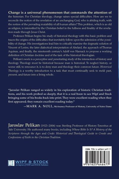Change is a universal phenomenon that commands the attention of the historian. For Christian theology, change raises special difficulties. How are we to reconcile the notion of the revelation of an unchanging God, who is abiding truth, with the notion of the pervading mutability of all human affairs? This problem, which is as old as religion, is intensified by the Christian belief in the fullness and finality of the revelation made through Jesus Christ. Professor Pelikan begins his study of historical theology with this basic problem and traces the origins of the difficulties that inevitably follow upon the admission of the possibility of change. His investigations lead him to critically examine the dogmatic solution of Vincent of Lerins, the later dialectical interpretation of Abelard, the approach of Thomas Aquinas, and finally, the nineteenth century's Adolf von Harnack to propose a working definition of Christian doctrine and of the task of the historical theologian. Pelikan's work is a perceptive and penetrating study of the interaction of history and theology. Theology must be historical because man is historical. To neglect history, or worse still, to renounce it, is to deny man and theology their common future. Historical Theology is a worthy introduction to a task that must continually seek to weld past, present, and future into a living whole.