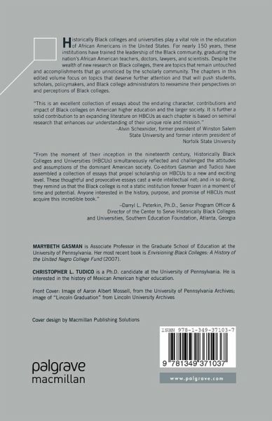 "From the moment of their inception in the nineteenth century, Historically Black Colleges and Universities (HBCUs) simultaneously reflected and challenged the attitudes and assumptions of the dominant American society. Co-editors Gasman and Tudico have assembled a collection of essays that propel scholarship on HBCUs to a new and exciting level. These thoughtful and provocative essays cast a wide intellectual net; and in so doing, they remind us that the Black college is not a static institutionforever frozen in a moment of time and potential. Anyone interested in the history, purpose, and promise of HBCUs must acquire this incredible book. - Darryl L. Peterkin, Ph.D., Senior Program Officer & Director of the Center to Serve Historically Black Colleges and Universities, Southern Education Foundation, Atlanta, Georgia