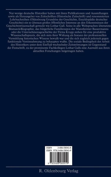 Nur wenige deutsche Historiker haben mit ihren Publikationen und Ausstellungen sowie als Herausgeber von Zeitschriften (Historische Zeitschrift) und renommierten Lehrbuchreihen (Oldenbourg Grundriss der Geschichte, Enzyklopädie deutscher Geschichte) ein so überaus großes öffentliches Interesse an den Erkenntnissen der Geschichtswissenschaft geweckt wie Lothar Gall. Seine in alle Weltsprachen übersetzte Bismarck-Biografie, das bürgerliche Familienepos der Mannheimer Bassermanns oder die Unternehmensgeschichte der Firma Krupp stehen für eine produktive Wissenschaftspraxis, die sich stets ihrer Wirkung als Instanz der professionellen Vermittlung historischen Wissens im Klaren war und die sich zugleich jederzeit gegen funktionale Vereinnahmung zu behaupten wusste. Die soziale Bedingtheit der Arbeit des Historikers unter dem Einfluss wechselnder Zeitströmungen ist Gegenstand der Festschrift, zu der prominente Fachkollegen Lothar Galls eine Auswahl aus ihren aktuellen Forschungen beigetragen haben.
