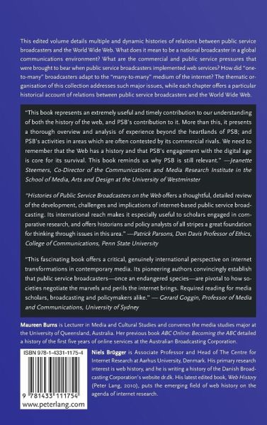 Contents: Nicholas W. Jankowski: Foreword: Public Service Broadcasters and the Web: Interplay of Convenience, Necessity, and Challenge - Maureen Burns/Niels Brügger: Introduction: Histories of Public Service Broadcasters on the Web: Thematic Concerns - An Nguyen/Alberto García: When Public Service Is the Name of the Game: The Evolution of British and Spanish Public Service Broadcasters in Online Journalism - Einar Thorsen: The Second Digital Wave: BBC News Online, Embedded Video and the iPlayer - Nikki Usher/Patricia Riley/Vikki Porter: NPR Online: Public Service Communication at the Center of National Public Radio - Maureen Burns: Protecting the Brand: A History of ABC Online News-as-Commodity - Kenneth Murphy: RTE Online: Public Objectives and Commercial Imperatives - Hallvard Moe: Between Public Service and Commercial Venture: The Norwegian Broadcasting Corporation on the Web 1994-2000 - Niels Brügger: The Idea of Public Service in the Early History of DR Online - Amit M. Schejter/Merav Katz-Kimchi: « . . . [and] They Formed Themselves into a Single Unit»: The Development of the Israeli Broadcasting Authority Website - Benedetta Brevini: Southern European Public Service Broadcasters Expanding Online: A Policy Study of RAI and RTVE's Online Activities - Meghan Grosse/David W. Park: Public Media and the Web in the U.S.: The Case of Vocalo - Anne Dunn: Regional Radio and Online Media Production: An Australian Broadcasting Corporation Case Study - Brian O'Neill/Michael J. Murphy: Canadian Content, Public Broadcasting and the Internet: CBC's Online Strategy 1995-2000 - Fiona Martin: Vox Populi, Vox Dei: ABC Online and the Risks of Dialogic Interaction - Anja Bechmann: User Participation at the Danish Broadcasting Corporation 1998-2010: Changing Patterns - Shawn Powers: From Broadcast to Networked Journalism: The Case of Al-Jazeera English.