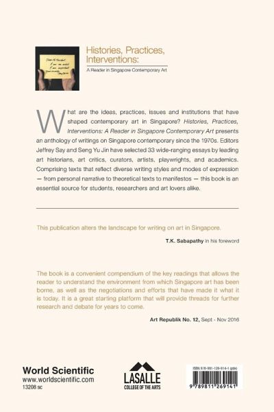 Histories, Practices, Interventions: A Reader in Singapore Contemporary Art brings together key writings about ideas, practices, issues and art institutions that shape the understanding of contemporary art in Singapore. This reader is conceived as an essential resource for advancing critical debates on post-independence Singapore art and culture. It comprises a total of thirty-three texts by art historians, art theorists, art critics, artists and curators. In addition, there is an introduction by the co-editors, Jeffrey Say and Seng Yu Jin,as well as three section introductions contributed by Seng Yu Jin; artist, curator and writer Susie Wong; and art educator and writer Lim Kok Boon.