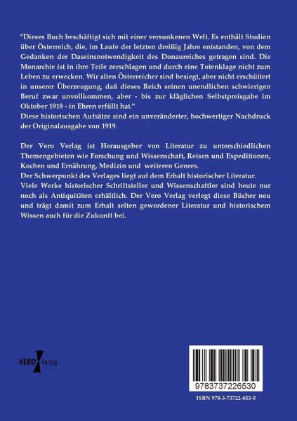 "Dieses Buch beschäftigt sich mit einer versunkenen Welt. Es enthält Studien über Österreich, die, im Laufe der letzten dreißig Jahre entstanden, von dem Gedanken der Daseinsnotwendigkeit des Donaureiches getragen sind. Die Monarchie ist in ihre Teile zerschlagen und durch eine Totenklage nicht zum Leben zu erwecken. Wir alten Österreicher sind besiegt, aber nicht erschüttert in unserer Überzeugung, daß dieses Reich seinen unendlichen schwierigen Beruf zwar unvollkommen, aber - bis zur kläglichen Selbstpreisgabe im Oktober 1918 - in Ehren erfüllt hat."
