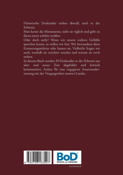 Historische Denkmäler stehen überall, auch in der Schweiz.Man kennt die Monumente, sieht sie täglich und geht an ihnen meist achtlos vorüber.Oder doch nicht? Wenn wir unsere Gefühle sprechen lassen, so stellen wir fest: Wir bewundern diese Erinnerungsstätten oder hassen sie. Vielleicht fragen wir auch, weshalb sie errichtet wurden und warum sie noch stehen.In diesem Buch werden 34 Denkmäler in der Schweiz aus alter und neuer Zeit abgebildet und kritisch kommentiert: Anlass für eine engagierte Auseinandersetzung mit der Vergangenheit unseres Landes.