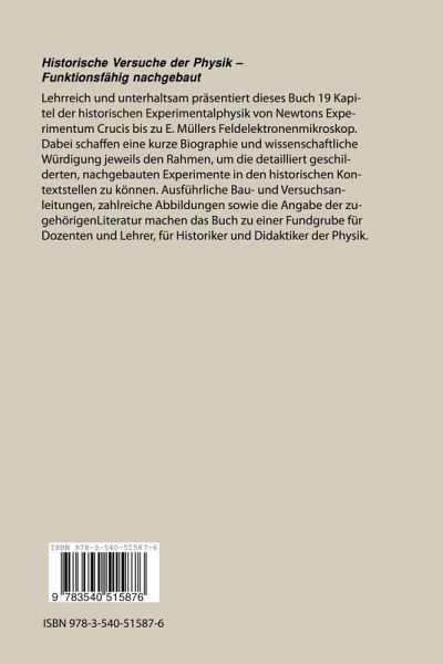 Lehrreich und unterhaltsam präsentiert dieses Buch 19 Kapitel der historischen Experimentalphysik von Newtons Experimentum Crucis bis zu E. Müllers Feldelektronenmikroskop. Dabei schaffen eine kurze Biographie und wissenschaftliche Würdigung jeweils den Rahmen, um die detailliert geschilderten, nachgebauten Experimente in den historischen Kontext stellen zu können. Ausführliche Bau- und Versuchsanleitungen, zahlreiche Abbildungen sowie die Angabe der zugehörigen Literatur machen das Buch zu einer Fundgrube für Dozenten und Lehrer, für Historiker und Didaktiker der Physik.