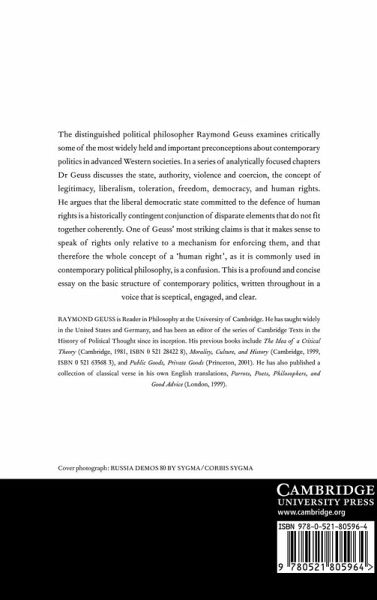 The distinguished political philosopher Raymond Geuss examines critically some of the most widely held and important preconceptions about contemporary politics held in advanced Western societies. In a series of analytically focused chapters Dr Geuss discusses the state, authority, violence and coercion, the concept of legitimacy, liberalism, toleration, freedom, democracy, and human rights. He argues that the liberal democratic state committed to the defense of human rights is a historically contingent conjunction of disparate elements that do not fit together coherently. One of Geuss's most striking claims is that it makes sense to speak of rights only relative to a mechanism for enforcing them, and that therefore the whole concept of a 'human right', as it is commonly used in contemporary political philosophy, is a confusion. This is a profound and concise essay on the basic structure of contemporary politics, written throughout in a voice that is sceptical, engaged, and clear.