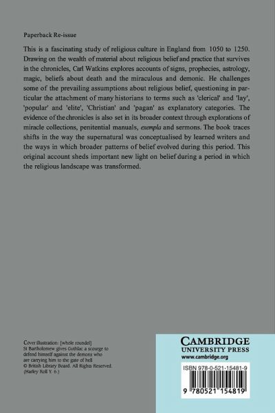 This is a fascinating study of religious culture in England from 1050 to 1250. Drawing on the wealth of material about religious belief and practice that survives in the chronicles, Carl Watkins explores the accounts of signs, prophecies, astrology, magic, beliefs about death, and the miraculous and demonic. He challenges some of the prevailing assumptions about religious belief, questioning in particular the attachment of many historians to terms such as 'clerical' and 'lay', 'popular' and 'elite', 'Christian' and 'pagan' as explanatory categories. The evidence of the chronicles is also set in its broader context through explorations of miracle collections, penitential manuals, exempla and sermons. The book traces shifts in the way the supernatural was conceptualized by learned writers and the ways in which broader patterns of belief evolved during this period. This original account sheds important light on belief during a period in which the religious landscape was transformed.
