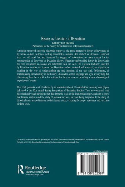 Although perceived since the sixteenth century as the most impressive literary achievement of Byzantine culture, historical writing nevertheless remains little studied as literature. Historical texts are still read first and foremost for nuggets of information, as main sources for the reconstruction of the events of Byzantine history. Whatever can be called literary in these works has been considered as external and detachable from the facts. The 'classical tradition' inherited by Byzantine writers, the features that Byzantine authors imitated and absorbed, are regarded as standing in the way of understanding the true meaning of the text and, furthermore, of contaminating the reliability of the history. Chronicles, whose language and style are anything but classicizing, have been held in low esteem, for they are seen as providing a mere chronological exposition of events. This book presents a set of articles by an international cast of contributors, deriving from papers delivered at the 40th annual Spring Symposium of Byzantine Studies. They are concerned with historical and visual narratives that date from the sixth to the fourteenth century, and aim to show that literary analyses and the study of pictorial devices, far from being tangential to the study of historical texts, are preliminary to their further study, exposing the deeper structures and purposes of these texts.