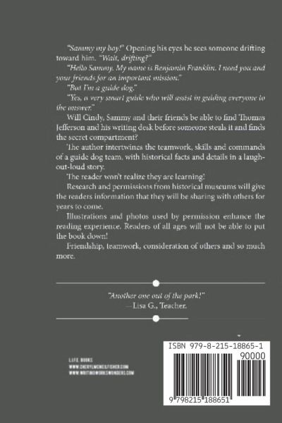 The reader will be hooked right from the start when the spirit of Benjamin Franklin visits Sammy requesting his assistance in a mission of national importance. But, first, they need to find Thomas Jefferson's portable writing desk. It holds the original draft of the Declaration of Independence. The reader is introduced to 1776 Philadelphia, the people, historical sites, inventions, and more. The author creatively intertwines fact and fiction by using dialogue that makes the reader feel like they are in the story. This is Cheryl's fourth book in The Adventure of a Guide Dog Team series. Readers will learn more commands, why a guide dog team has to do things a certain way, and there is even a diagram showing the different parts of Sammy's harness. The anticipation builds and you'll be anticipating where they are going next. A book that adults will enjoy too. A conversation between Brodyn, the carriage horse, and Sammy will encourage discussions of how we are all differently abled. Brodyn feels left out because he is too big to go with the group. Sammy shares a story about Cindy growing several inches one summer, making her taller than all her friends. The Library Company combines the old and the new, Mr. Franklin's love of books and sharing them with others. Walking through an exhibit, they discuss many of Mr. Franklin's inventions. When they pull up to the Liberty Bell in chapter four, they gasp at the sight of John Hancock writing his flamboyant signature all over the bell… not realizing until they go inside that he is using invisible ink. Mr. Hancock then joins them on their quest. Along their route, a spirited fire brigade clangs and races right through their carriage, which opens the discussion of the Fire Insurance Company. Mr. Franklin talks about Philosophical Hall as Brodyn slowly walks on. At Carpenter Hall, they notice Patrick Henry. Mr. Henry greets the friends with his famous quote about being an American, then disappears. Mr. Franklin shares the importance. Calling ones self an American, rather than a Pennsylvanian, New Yorker or Virginian, solidified unification. They travel one of the walking tours in Philadelphia which include: The Betsy Ross House, Elfreth's Alley, Lunch at the Old City Tavern with Martha and George Washington, Dollie and James Madison, John and young John Quincy Adams and Sammy meets Mr. Washington's hound, Volcan shares a story about why he is out of favor with Mrs. Washington. Something he did at one of their dinner parties. Oops! They find Mr. Jefferson at the Graff House, where he wrote the Declaration of Independence. Passing the Christ church cemetery along the drive, they meet Mr. Franklin's daughter Rebecca and her son Benjamin. The reader will learn about some other founding fathers buried in the cemetery. Thomas Jefferson is indeed at the Graff house, working. He explains his concern after he witnessed some shady characters looming around the museum display. The spirits and friends devise a plan to scare the pants off the boys so they never think of stealing again. The reader will laugh out loud while learning some historical facts. They are sure to want to learn more about guide dog teams and Philadelphia and our Declaration of Independence. Thank you to the museums who provided photos and much history. *****. Please Note ***** This version/format has black and white illustrations. For color, contact the Author.