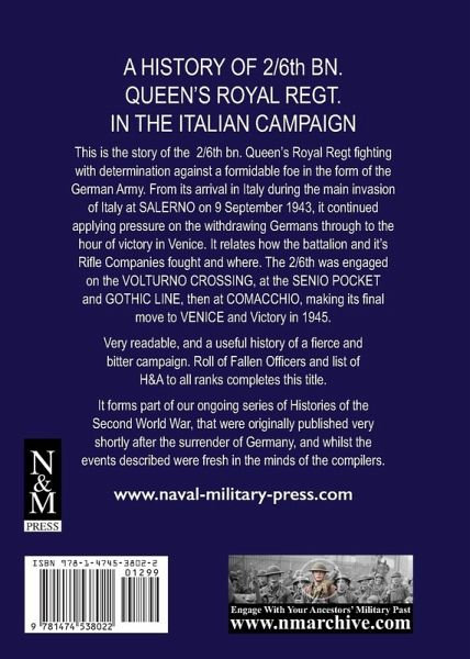 This is the story of the 2/6TH Bn. QUEEN'S ROYAL REGT fighting with determination against a formidable foe in the form of the German Army. From its arrival in Italy during the main invasion of Italy at SALERNO on 9 September 43, it continued applying pressure on the withdrawing Germans through to the hour of victory in Venice. It relates how the battalion, and it's Rifle Companies, fought and where. The 2/6th was engaged on the VOLTURNO CROSSING, at the SENIO POCKET and GOTHIC LINE, then at COMACCHIO, making its final move to TO VENICE and Victory in 1945. Very readable, and a useful history of a fierce and bitter campaign. Roll Of Fallen Officers and list of H&A to all ranks completes this title. It forms part of our ongoing series of Histories of the Second World War, that were originally published very shortly after the surrender of Germany, and whilst the events described were fresh in the minds of the compilers.