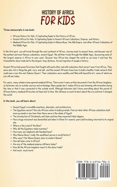 Three manuscripts in one book: African History for Kids: A Captivating Guide to the History of Africa Ancient Africa for Kids: A Captivating Guide to Ancient African Civilizations, Empires, and History Medieval Africa for Kids: A Captivating Guide to Mansa Musa, the Mali Empire, and other African Civilizations of the Middle Ages In the first part, you will travel through the vast continent of Africa. Journey back to ancient times, and discover one of the earliest and most famous civilizations, ancient Egypt. We will then travel through the Middle Ages, discovering some of the largest empires in Africa to ever exist. Discover how Africa has shaped the world as we know it and how the transatlantic slave trade led to the largest, long-distance, forced migration of people in history. In the first part of this book, you will learn about: Ancient Egypt's incredible inventions, pharaohs, and architecture. The Egyptians weren't the only African nation to build pyramids. Find out what other African civilizations built more pyramids in one town than there were in the whole of Egypt! The introduction of Christianity and Islam and how they impacted tribal religions. How a huge monument was dismantled and taken to Rome for seventy years before being returned to its original site. Things are looking up! What the future holds for Africa. Ancient Africa had powerful armies that fought with each other and with civilizations that weren't even from Africa. They were also rich in things like gold, ivory, and salt, and the ancient Africans knew how to build a healthy trade network that could even cross the vast Sahara Desert. Their civilizations were wealthy and filled with beautiful art, some of which we can still see today. In the second part of this book, you will discover: Where is the Land of the Bow? Why did the Egyptians make mummies? How many war elephants did Hannibal have? What civilization conquered Egypt? What is the legend of King Solomon, the Queen of Sheba, and their son? Where exactly was ancient Ghana? For years, many scholars have ignored medieval Africa. There aren't many written documents from the African kingdoms, so historians rely on outside sources and archeology. Many people don't realize Africa was brimming with innovation during this time or that it was connected to the outside world. Although historians don't know everything about this period of African history, medieval Africa has not been lost to time. We still have so much to learn about this era and how it changed the world. In the third part of this book, you will discover: Was Mansa Musa I really the wealthiest person in world history? Why wasn't the Ghana Empire close to modern Ghana? How did Islam come to Africa? Are any of the medieval empires still here today? How did the African kingdoms react to the slave trade? Who was the most famous African leader during the Middle Ages? And much, much more!