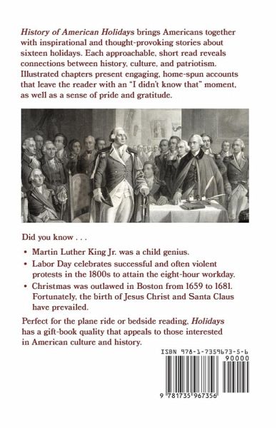 This book reveals the overall connection between American holidays, history, culture, and patriotism. Each chapter presents an interesting home-spun account of the holiday's unique history and its ties to America's social and cultural fabric. History of American Holidays brings Americans together with inspirational and thought-provoking stories about sixteen holidays, including in this second edition, the new Juneteenth holiday and an expanded piece on the Fourth of July. Each chapter presents an approachable short read that leaves the reader with an "I didn't know that" moment as well as a sense of patriotic gratitude. Did you know....? · Martin Luther King was a child genius · Memorial Day grew from similar and independent small gatherings of healing after the Civil War · Labor Day celebrates successful and often violent protests in the 1800s to attain the 8-hour workday. · Christmas was outlawed in Boston from 1659 to 1681. Fortunately, the birth of Jesus Christ and Santa Claus have prevailed. Perfect for the plane ride or bedside reading, Holidays has a gift book quality that is suitable for those interested in American culture as well as history.