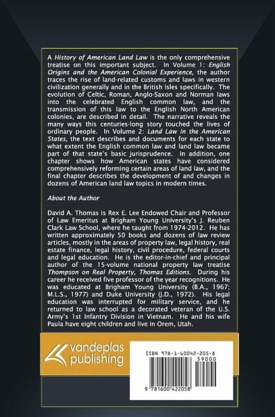 A History of American Land Law is the only comprehensive treatise on this important subject. In Volume 1: English Origins and the American Colonial Experience, the author traces the rise of land-related customs and laws in western civilization generally and in the British Isles specifically. The evolution of Celtic, Roman, Anglo-Saxon and Norman laws into the celebrated English common law, and the transmission of this law to the English North American colonies, are described in detail. The narrative reveals the many ways this centuries-long story touched the lives of ordinary people. In Volume 2: Land Law in the American States, the text describes and documents for each state to what extent the English common law and land law became part of that state's basic jurisprudence. In addition, one chapter shows how American states have considered comprehensively reforming certain areas of land law, and the final chapter describes the development of and changes in dozens of American land law topics in modern times. About the author: David A. Thomas is Rex E. Lee Endowed Chair and Professor of Law Emeritus at Brigham Young University's J. Reuben Clark Law School, where he taught from 1974-2012. He has written approximately 50 books and dozens of law review articles, mostly in the areas of property law, legal history, real estate finance, legal history, civil procedure, federal courts and legal education. He is the editor-in-chief and principal author of the 15-volume national property law treatise Thompson on Real Property, Thomas Editions. During his career he received five professor of the year recognitions. He was educated at Brigham Young University (B.A., 1967; M.L.S., 1977) and Duke University (J.D., 1972). His legal education was interrupted for military service, and he returned to law school as a decorated veteran of the U.S. Army's 1st Infantry Division in Vietnam. He and his wife Paula have eight children and live in Orem, Utah.