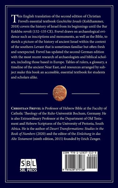 This English translation of the second edition of Christian Frevel's essential textbook Geschichte Israels (Kohlhammer, 2018) covers the history of Israel from its beginnings until the Bar Kokhba revolt (132-135 CE). Frevel draws on archaeological evidence, inscriptions and monuments, and the Bible to sketch a picture of the history of ancient Israel within the context of the southern Levant that is sometimes familiar but often fresh and unexpected. Tables of rulers, a glossary, a timeline of the ancient Near East, and resources arranged by subject make this an accessible, essential, and up-to-date textbook for students and scholars alike.