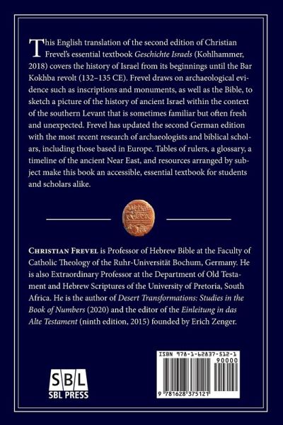 This English translation of the second edition of Christian Frevel's essential textbook Geschichte Israels (Kohlhammer, 2018) covers the history of Israel from its beginnings until the Bar Kokhba revolt (132-135 CE). Frevel draws on archaeological evidence, inscriptions and monuments, and the Bible to sketch a picture of the history of ancient Israel within the context of the southern Levant that is sometimes familiar but often fresh and unexpected. Tables of rulers, a glossary, a timeline of the ancient Near East, and resources arranged by subject make this an accessible, essential, and up-to-date textbook for students and scholars alike.