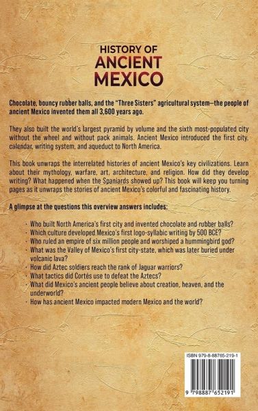 Chocolate, bouncy rubber balls, and the "Three Sisters" agricultural system-the people of ancient Mexico invented them all 3,600 years ago. They also built the world's largest pyramid by volume and the sixth most-populated city without the wheel and without pack animals. Ancient Mexico introduced the first city, calendar, writing system, and aqueduct to North America. This book unwraps the interrelated histories of ancient Mexico's key civilizations. Learn about their mythology, warfare, art, architecture, and religion. How did they develop writing? What happened when the Spaniards showed up? This book will keep you turning pages as it unwraps the stories of ancient Mexico's colorful and fascinating history. A glimpse at the questions this overview answers includes: Who built North America's first city and invented chocolate and rubber balls? Which culture developed Mexico's first logo-syllabic writing by 500 BCE? Who ruled an empire of six million people and worshiped a hummingbird god? What was the Valley of Mexico's first city-state, which was later buried under volcanic lava? How did Aztec soldiers reach the rank of Jaguar warriors? What tactics did Cortés use to defeat the Aztecs? What did Mexico's ancient people believe about creation, heaven, and the underworld? How has ancient Mexico impacted modern Mexico and the world?