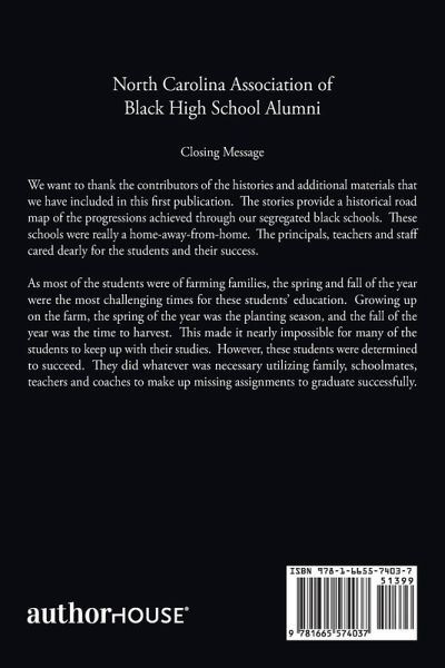 North Carolina Association of Black High School Alumni Closing Message We want to thank the contributors of the histories and additional materials that we have included in this first publication. The stories provide a historical road map of the progressions achieved through our segregated black schools. These schools were really a home-away-from-home. The principals, teachers and staff cared dearly for the students and their success. As most of the students were of farming families, the spring and fall of the year were the most challenging times for these students' education. Growing up on the farm, the spring of the year was the planting season, and the fall of the year was the time to harvest. This made it nearly impossible for many of the students to keep up with their studies. However, these students were determined to succeed. They did whatever was necessary utilizing family, schoolmates, teachers and coaches to make up missing assignments to graduate successfully.