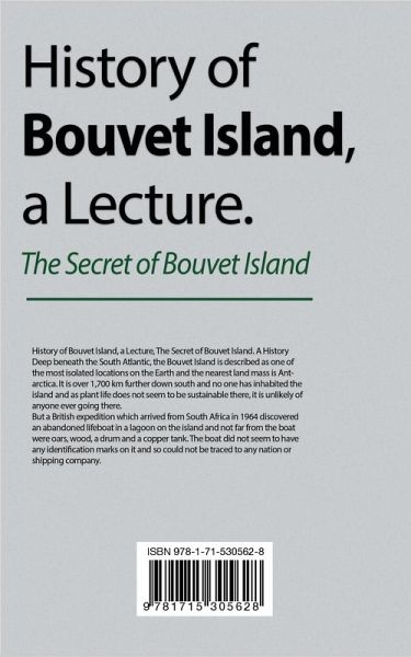 History of Bouvet Island, a Lecture, The Secret of Bouvet Island. A History Deep beneath the South Atlantic, the Bouvet Island is described as one of the most isolated locations on the Earth and the nearest land mass is Antarctica. It is over 1,700 km further down south and no one has inhabited the island and as plant life does not seem to be sustainable there, it is unlikely of anyone ever going there. But a British expedition which arrived from South Africa in 1964 discovered an abandoned lifeboat in a lagoon on the island and not far from the boat were oars, wood, a drum and a copper tank. The boat did not seem to have any identification marks on it and so could not be traced to any nation or shipping company