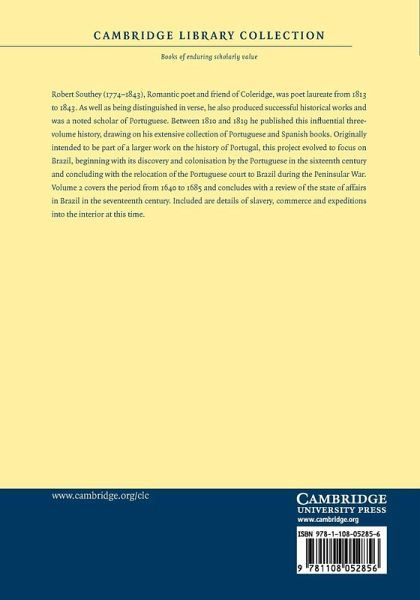 Robert Southey (1774-1843), Romantic poet and friend of Coleridge, was poet laureate from 1813 to 1843. As well as being distinguished in verse, he also produced successful historical works and was a noted scholar of Portuguese. Between 1810 and 1819 he published this influential three-volume history, drawing on his extensive collection of Portuguese and Spanish books. Originally intended to be part of a larger work on the history of Portugal, this project evolved to focus on Brazil, beginning with its discovery and colonisation by the Portuguese in the sixteenth century and concluding with the relocation of the Portuguese court to Brazil during the Peninsular War. Volume 2 covers the period from 1640 to 1685 and concludes with a review of the state of affairs in Brazil in the seventeenth century. Included are details of slavery, commerce and expeditions into the interior at this time.