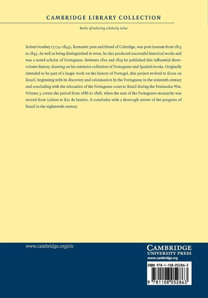 Robert Southey (1774-1843), Romantic poet and friend of Coleridge, was poet laureate from 1813 to 1843. As well as being distinguished in verse, he also produced successful historical works and was a noted scholar of Portuguese. Between 1810 and 1819 he published this influential three-volume history, drawing on his extensive collection of Portuguese and Spanish books. Originally intended to be part of a larger work on the history of Portugal, this project evolved to focus on Brazil, beginning with its discovery and colonisation by the Portuguese in the sixteenth century and concluding with the relocation of the Portuguese court to Brazil during the Peninsular War. Volume 3 covers the period from 1686 to 1808, when the seat of the Portuguese monarchy was moved from Lisbon to Rio de Janeiro. It concludes with a thorough review of the progress of Brazil in the eighteenth century.