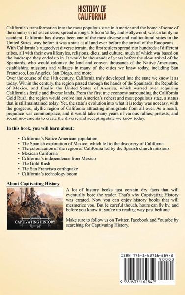 If you want to discover the influential and captivating history of California, then read on... California's transformation into the most populous state in America and the home of some of the country's richest citizens, spread amongst Silicon Valley and Hollywood, was certainly no accident. California has always been one of the most diverse and multicultural states in the United States, way before it was a state at all and even before the arrival of the Europeans. With California's rugged yet diverse terrain, the first settlers spread into hundreds of different tribes, all with their own lifestyles, religions, diets, and culture, much of which was based on the landscape they ended up in. It would be thousands of years before the slow arrival of the Spaniards, who would colonize the land and convert thousands of the Native Americans, establishing missions and villages in many of the cities we know today, including San Francisco, Los Angeles, San Diego, and more. Over the course of the 18th century, California truly developed into the state we know it as today. Within the century, the region passed through the hands of the Spaniards, the Republic of Mexico, and finally, the United States of America, which warred over acquiring California's fertile and diverse lands. From the first true economy surrounding the California Gold Rush, the region would evolve into America's richest and most populous state, a status that is still maintained today. Yet, the state's evolution into what it is today was not easy, with the gorgeous, idyllic region of California attracting immigrants from all over. As a result, prejudice was commonplace, and it would take many years of various rallies, protests, and social movements to create the diverse and accepting state we know today. In this book, you will learn about:California's Native American population The Spanish exploration of Mexico, which led to the discovery of California The colonization of the region of California led by the Spanish church missions Mexican California California's independence from Mexico The Gold Rush The San Francisco earthquake The effects of World War I and II on California The socio-political reforms that occurred over the course of the 20th century California's technology boom How California transitioned into one of the most populous and affluent states in America as well as one of the more diverse and liberal states in the country And much more! Scroll up and click the "add to cart" button to learn more about the history of California!