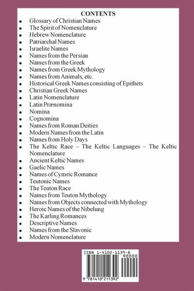 CONTENTS Glossary of Christian Names The Spirit of Nomenclature Hebrew Nomenclature Patriarchal Names Israelite Names Names from the Persian Names from the Greek Names from Greek Mythology Names from Animals, etc. Historical Greek Names consisting of Epithets Christian Greek Names Latin Nomenclature Latin PrFnomina Nomina Cognomina Names from Roman Deities Modern Names from the Latin Names from Holy Days The Keltic Race - The Keltic Languages - The Keltic Nomenclature Ancient Keltic Names Gaelic Names Names of Cymric Romance Teutonic Names The Teuton Race Names from Teuton Mythology Names from Objects connected with Mythology Heroic Names of the Nibelung The Karling Romances Descriptive Names Names from the Slavonic Modern Nomenclature
