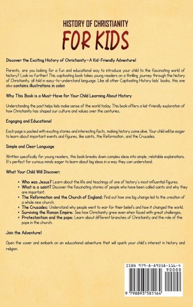 Discover the Exciting History of Christianity-A Kid-Friendly Adventure! Parents, are you looking for a fun and educational way to introduce your child to the fascinating world of history? Look no further! This captivating book takes young readers on a thrilling journey through the history of Christianity, all told in easy-to-understand language. Like all other Captivating History kids' books, this one also contains illustrations in color. Why This Book is a Must-Have for Your Child Learning About History Understanding the past helps kids make sense of the world today. This book offers a kid-friendly exploration of how Christianity has shaped our culture and values over the centuries. What Your Child Will Discover: ¿¿ Who was Jesus? Learn about the life and teachings of one of history's most influential figures. ¿¿¿¿ What is a saint? Discover the fascinating stories of people who have been called saints and why they are important. ¿¿¿¿¿ The Reformation and the Church of England: Find out how one big change led to the creation of a whole new church. ¿¿ The Crusades: Understand why people went to war for their beliefs and how it changed the world. ¿¿¿¿¿ Surviving the Roman Empire: See how Christianity grew even when faced with great challenges. ¿¿ Protestantism and the pope: Learn about different branches of Christianity and the role of the pope in the church.