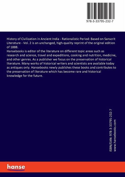 History of Civilization in Ancient India - Rationalistic Period: Based on Sanscrit Literature - Vol. 2 is an unchanged, high-quality reprint of the original edition of 1888. Hansebooks is editor of the literature on different topic areas such as research and science, travel and expeditions, cooking and nutrition, medicine, and other genres. As a publisher we focus on the preservation of historical literature. Many works of historical writers and scientists are available today as antiques only. Hansebooks newly publishes these books and contributes to the preservation of literature which has become rare and historical knowledge for the future.